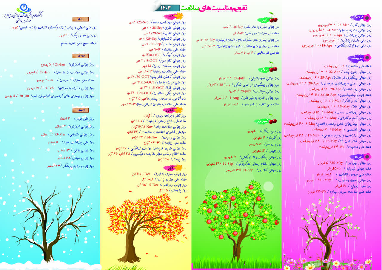تقویم مناسبتی سال 1403 1403/05/09 - 07:26 - تعداد بازدید: 37 - تعداد بازدیدکننده: 37 - کد خبر : 333577 - گروه خبری : آموزه های سلامت - تعداد نظرات : 0 تقویم مناسبتی
